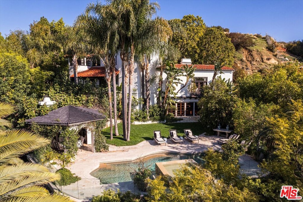 Located on a private and expansive lot with incredible views in the upper Outpost Estates lies this elegant and tastefully restored historic Spanish Estate. This one-of-a-kind residence boasts a lineage of impressive ownership; upon entering the front privacy gate, it's clear to see what has attracted tastemakers to this property for nearly a century.The dramatic living room boasts high, chapel-like ceilings, excellent art walls, and a Juliette balcony that overlooks the city. On the main floor, you'll find a spacious dining room with seating for up to fourteen, a recently remodeled chef's kitchen featuring custom cabinetry, marble finishes, and premium Lacanche and Sub-Zero appliances. A breakfast room opens onto a balcony ideal for entertaining while enjoying city views.Descending the staircase, a soothing stone water feature guides you to a downstairs den and library, complete with custom bookshelves and doors that lead directly to the backyard. Outside, a lush, flat lawn surrounds a pool and spa, framed by mature palms that enhance privacy while maintaining views. An outdoor chef's kitchen includes ample seating, a bar, built-in stone banquette with a firepit, and top-tier appliances by Viking and Miele.Upstairs, the primary suite offers two generous closets and an exquisitely crafted bathroom featuring imported stone, dual sinks, ironwork windows, and a soaking tub. A guest bedroom also on this level includes original tilework, two large closets, an ensuite bath, and unobstructed city views. The property's unique turret provides additional flexible space ideal for a guest room, gym, or office, offering panoramic views from Downtown to the ocean.A fourth bedroom also with ensuite bath and separate entrance near the pool is perfect for guests. Meticulously landscaped grounds with mature trees and hedging complete this quintessential Old Hollywood estate. This residence uniquely blends privacy, prestige, elegance, and timeless charm a combination rarely available and impossible to replicate.