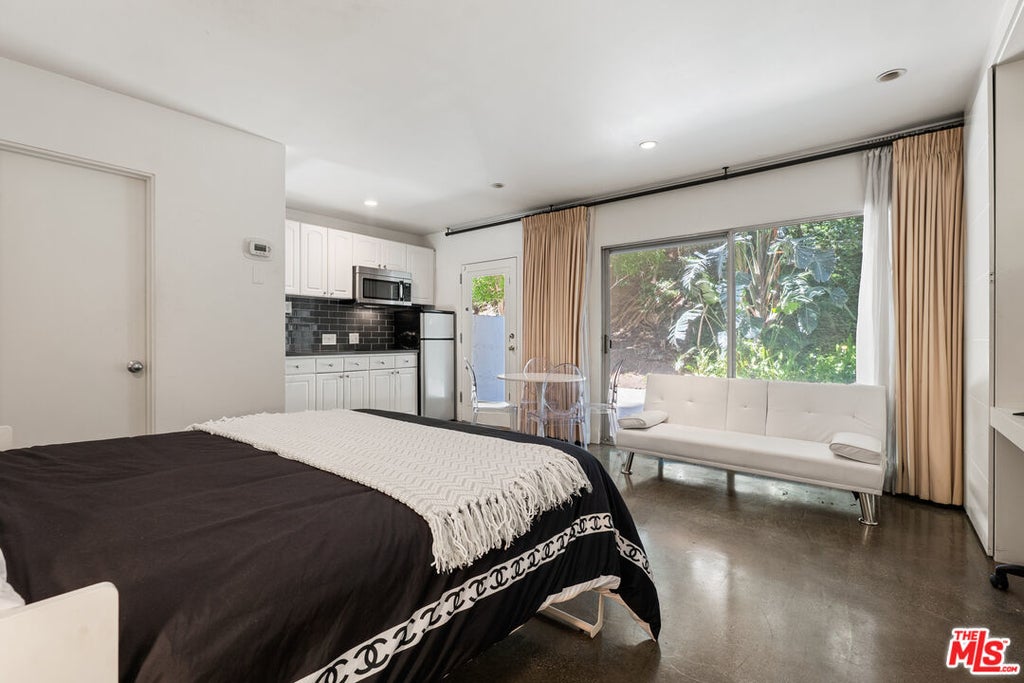 Live the high-style Hollywood lifestyle at Shoreham Towers, a full-service luxury building just one block above the iconic Sunset Strip. Once home to legends like Humphrey Bogart and David Lee Roth, this mid-century tower offers 24-hour concierge, valet parking, resort-style pool and spa, fitness center, sauna, dog park, and a stunning lobby lounge that feels like a five-star hotel. Unit B4 is a smartly renovated 304 sq ft studio that blends form and function. The sleek kitchen features white shaker cabinetry, a bold black subway tile backsplash, and stainless steel appliances. A custom Murphy bed with built-in side tables creates flexibility, easily converting your sleeping area to a stylish lounge space. The modern bath boasts striking herringbone tile and updated finishes, giving the home a polished, spa-like vibe. Rare for a studio, this home includes its own private outdoor patio, offering a peaceful extension of your living space with lush greenery just beyond your sliding doors--perfect for relaxing or entertaining in the California sunshine. Whether you're seeking a chic full-time residence, a lock-and-leave pied-a-terre or a high-end investment in one of L.A.'s most glamorous addresses, Shoreham Towers #B4 delivers luxury, convenience, and timeless style.