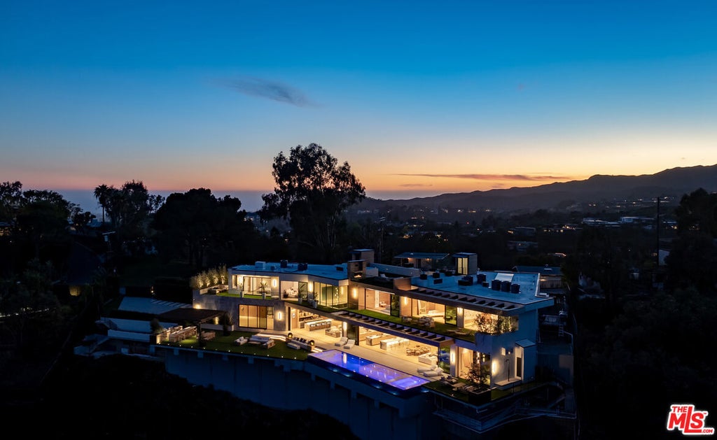 This newly constructed architectural estate, set on 1.2 sprawling acres, commands uninterrupted panoramic views of the city skyline and the iconic Getty Center. Designed with a mastery of form and function, every element has been thoughtfully composed to balance grandeur with intimacy. A herringbone stone motor court introduces the residence, leading to a glass-encased, air-conditioned four-car showroom. The entry is framed by a tranquil water feature and a lush living garden wall, setting the stage for the home's seamless integration of nature and design. Inside, elegant plastered walls and sky-high floor-to-ceiling glass create a gallery-like aesthetic, softened by warm travertine accents and European oak flooring.The soaring main living area is anchored by a dramatic double-height stone fireplace, floating terraces, and a striking olive tree centerpiece that blurs the boundary between indoors and out. A marble-clad bar with custom wood paneling offers an effortless transition to the pergola-covered outdoor kitchen and dining space, perfect for entertaining. The chef's kitchen is a showpiece, featuring a waterfall stone island, matchbook marble backsplash, a butler's pantry, a temperature-controlled wine showcase, and direct access to the laundry and staff quarters. Adjacent, the formal dining area, office/library, and one-of-a-kind sunken theater are all part of a flexible, open-concept layout that encourages both grand entertaining and intimate gatherings. Upstairs, the primary suite is a private retreat with a vast wraparound terrace, a spa-like ensuite encased in marble with a steam shower and soaking tub, and expansive walk-in closets. Five additional ensuite bedrooms, each with custom finishes and generous closets, surround an upper-level lounge and media room, designed for relaxation or more intimate entertaining. A dedicated wellness center offers a state-of-the-art gym, sauna, and steam room, while an elevator ensures seamless access throughout the home. Outside, vast terraces extend the living spaces, leading to an infinity-edge pool that appears to spill into the landscape beyond and overlooks otherworldly, head-on Getty Center vistas. Designed with solar capability, cutting-edge smart home integration, and a fully outfitted security system, this gated estate offers privacy, sophistication, and an architectural vision years in the making set against the breathtaking backdrop of Los Angeles.