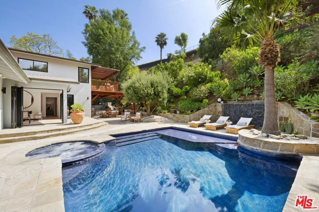 Tucked away in the coveted Laurel Hills enclave, this rare, fully remodeled 4BD/5BA residence seamlessly blends Old Hollywood charm with elevated mid-century modern design. Just steps from iconic Mulholland Drive and the scenic Fryman Canyon Trail and a short stroll to top rated Wonderland School. This private retreat sits on an expansive, usable lot offering exceptional space, style, and serenity. Step through an oversized glass pivot door into sun filled, open-concept living where white oak floors, Emtek hardware, and bespoke designer finishes set a sophisticated tone. The chef's kitchen stuns with custom walnut cabinetry, skylights, Thermador appliances, unlacquered brass fixtures, and a generous pass-through window ideal for effortless entertaining. Bifold doors blur the lines between indoors and out, revealing a resort-style backyard oasis with a mosaic tiled saltwater pool and spa, hillside gazebo, waterfall wall, outdoor movie theater, and built in pizza oven. True California living. The primary suite features canyon views, a custom walk in closet, and a spa inspired bath. Three additional en suite bedrooms offer flexibility for family, guests, or workspace. Additional upgrades include new windows, roof, doors, a dedicated laundry room, and ample off street parking. A rare blend of character, comfort, and curated luxury, this is quintessential Hollywood Hills living.