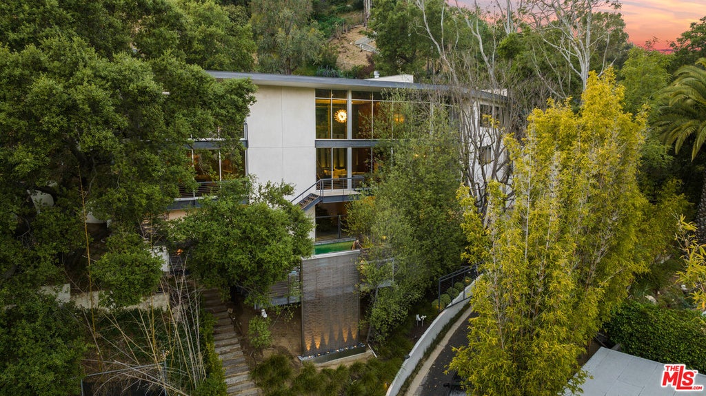 This secluded modern residence, crafted by renowned architect Steven Ehrlich after time spent in Africa with interiors by Mark Brunetz, offers unparalleled privacy at the end of a gated long driveway while surrounded by lush greenery. Floor-to-ceiling windows flood the living spaces with natural light and treetop views of the surrounding hills. The main level features a grand living room with a magnificent Murano glass chandelier, a functional fireplace, a massive family room with an adjacent crocodile leather imprint walled powder room, and a formal dining room. The custom kitchen boasts top-of-the-line Miele stainless steel appliances, Gaggenau and Fisher & Paykel, and an oversized island for casual dining. Additionally, the residence features a motorcourt for convenient parking and easy access to the home. Upstairs, the primary suite offers automatic shades along with blackout curtains, a TV that elegantly descends from the ceiling, as well as a walk-in closet with built-in walls. A spa-like en-suite bathroom adjoins with exquisite Bisazza tilework which cascades from light to dark as you walk through the room, plus a spa bathtub, steam shower and an in-wall Ariston espresso maker. The outdoor space includes a heated spa and pool with outdoor entertaining areas and a viewing deck that offers panoramic views from the top of the hill behind the home connected by a charming staircase. Three guest bedrooms, one with an en-suite bath, provide ample accommodation, while the additional guest bedrooms share a bathroom complete with both a shower and a bathtub. Underneath, a versatile space awaits, with a room equipped with a bathroom and shower which has easy access to the pool and can serve as a workout room or workplace. With meticulous attention to detail and modern conveniences throughout, this exceptional residence epitomizes luxury living in a serene oasis.